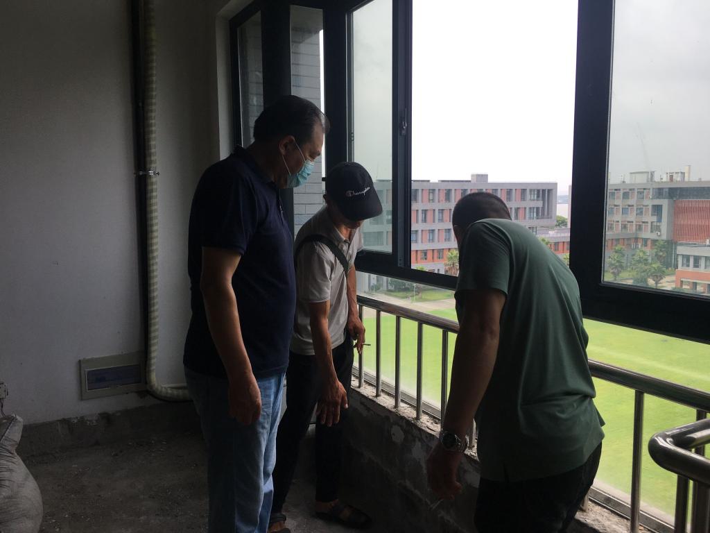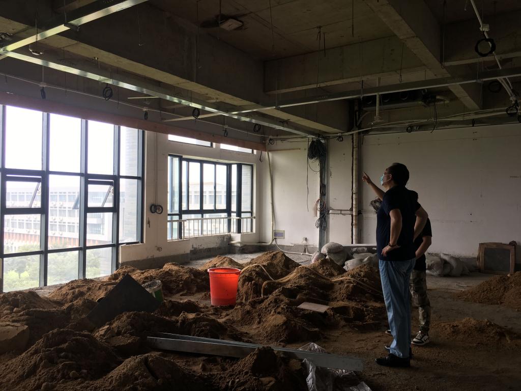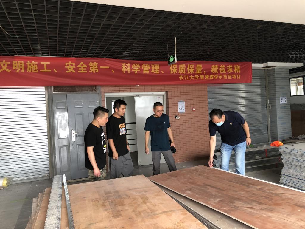(通讯员:郑瑞丰)2021年7月19日上午十点,公司党委书记邹火明、副经理郑瑞丰、综合办主任刘武洋以及武汉校区维修管理中心郭辉科长一行检查学院智慧教室工程建设,检查大雨过后有无新增漏水点、文明安全施工等情况,强调工程建设要确保安全、质量、进度。